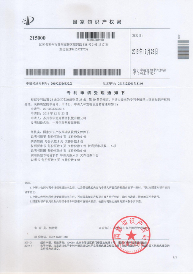 專利申請(qǐng)受理通知書201922326332.X